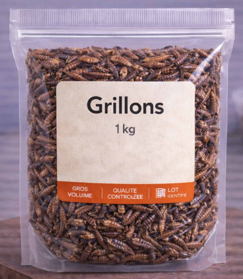 Le grillon est l’insecte le plus riche en protΓ©ines (65%) et le plus polyvalent en cuisine. Notre format 1 kg est destinΓ© aux professionnels de la restauration et aux fabricants de produits alimentaires innovants.