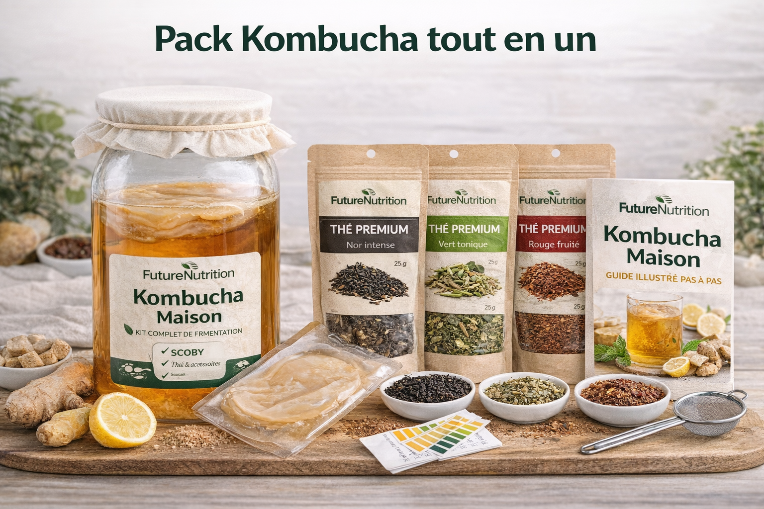 Tout ce qu’il faut pour prรฉparer votre Kombucha maison : souche vivante (SCOBY), bocal de fermentation, 3 variรฉtรฉs de thรฉ et accessoires. Suivez notre recette et dรฉgustez votre premiรจre boisson probiotique en 7-10 jours.