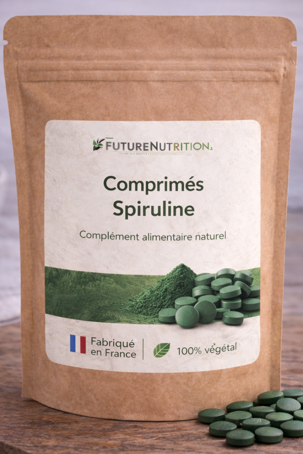 🌿 Notre + : Spiruline cultivée à Auroville depuis 18 ans, séchée au soleil, sans impuretés d’autres algues.